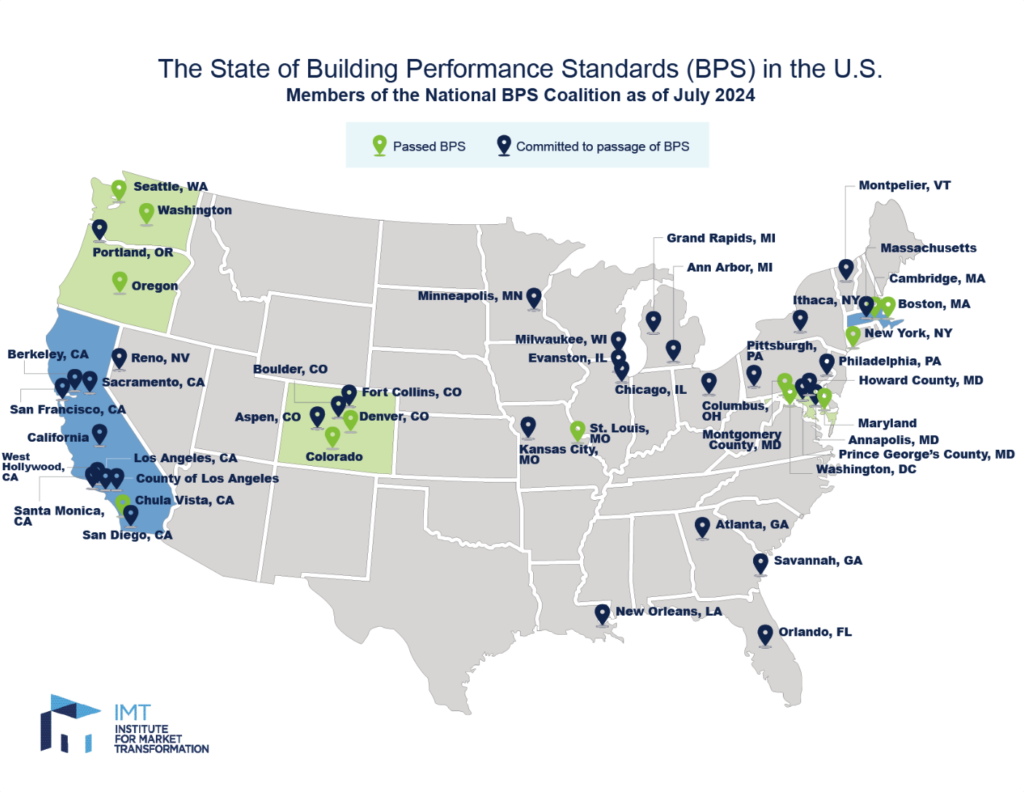 The Institute for Market Transformation, or IMT, is a national nonprofit focused on improving buildings for the people in them and the communities around them. We work at the intersection of businesses – including building owners and utilities – local and state governments, and, to some degree, the federal government. We also prioritize bringing in community members to inform policy design around buildings and business practices. This expands the idea of what building performance is. We’ll talk more about building performance standards as a policy later, but we’re going beyond just the technical and energy consumption focus of building performance, to include public health considerations and broader community impacts like displacement or affordability.